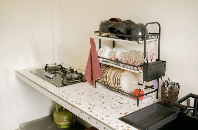 Another stylish alternative to a boring drying mat is one that’s made of diatomaceous earth. This sedimentary rock is super-porous, so it absorbs water at speed, reducing the risk of bacteria and mildew on your countertop, which can grow on mats made of textured material like microfiber. You can also declutter your counter with an adjustable over-the-sink drying rack, but if you want something you can hide away, consider using oven and cooling racks as makeshift drying racks.