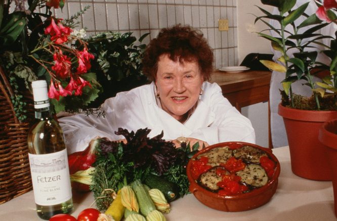 To make Queen of Sheba cake, cream butter and sugar together before beating in some egg yolks. Then incorporate cooled, melted chocolate (flavored with rum), ground almonds, almond extract, and flour into the mixture. Finally, fold through egg whites that have been whipped with cream of tartar and a dash of salt before baking. Julia Child’s favorite oven brand was the Garland Model 182 stove, but as long as your home oven is preheated to 350 degrees Fahrenheit, the cake should be ready in 25 minutes.