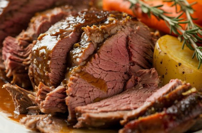 The best cuts of meat for pot roast include chuck roast, brisket, and rump roast because their striations of fat and connective tissue benefit the most from a slow cook by rendering down beautifully. Having said that, if you simmer your beef in canned mushroom soup and powdered onion soup mix, you can get away with using cuts that don’t have as much fat because the velvety quality of the intensely savory gravy will make up for any dryness.