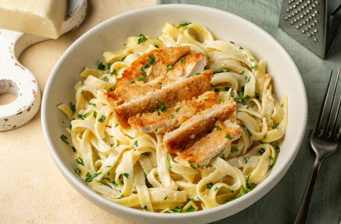 Give your Alfredo sauce a stir as it heats through to encourage all the flavors to meld together before adding it to your cooked fettuccine or any other noodles of choice. You should find that the sauce develops a slightly darker color and toasty aroma as it combines with the chicken drippings. Better yet, any seasonings, such as garlic powder or chili flakes, that you might have coated your chicken with before frying will also help to flavor the sauce, producing a finished dish with a harmonious taste. Of course, there’s nothing stopping you from heating up your sauce separately, but why not benefit from those yummy, super-savory flecks of concentrated goodness that are stuck to the pan?